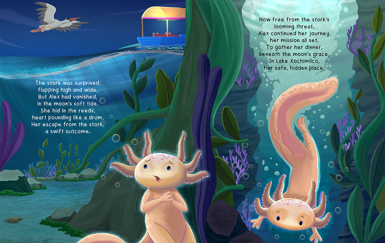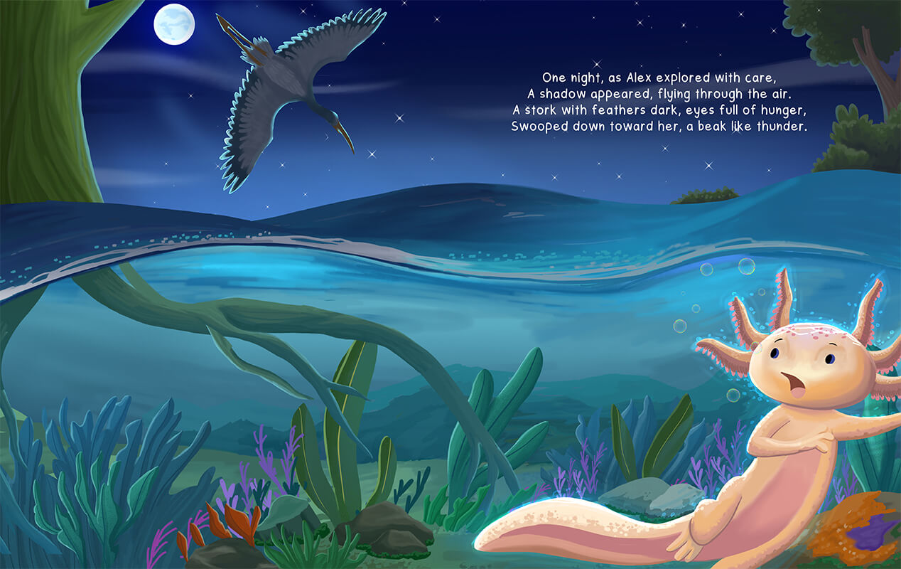 Will Alex make it out alive? This picture book, perfect for all ages, follows Alex on a thrilling adventure. While foraging for food, Alex encounters a hungry stork. Can she outsmart the predator and get home safely? Join Alex’s wild ride to find out!