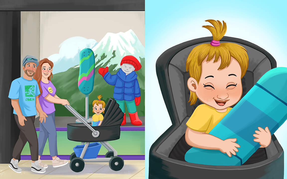 “Snowboard Baby” is based on a true story inspired by how a mom and dad learned to introduce snowboarding to their baby. Parents can use this book as a guide, and kids will love the story and cute illustrations!